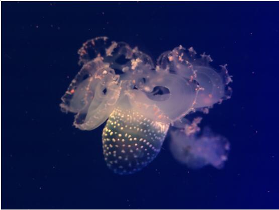 梦幻水母宫区,游客置身于五彩缤纷的水母宫,可以体验到水母用自己生命的轮回诠释着对海的眷恋,短暂却精彩至极……这里向游客展示了太平洋海刺水母、澳洲斑点水母、海月水母等种类,透明的身体轻盈的游动,让人们不禁感叹海洋的神奇。