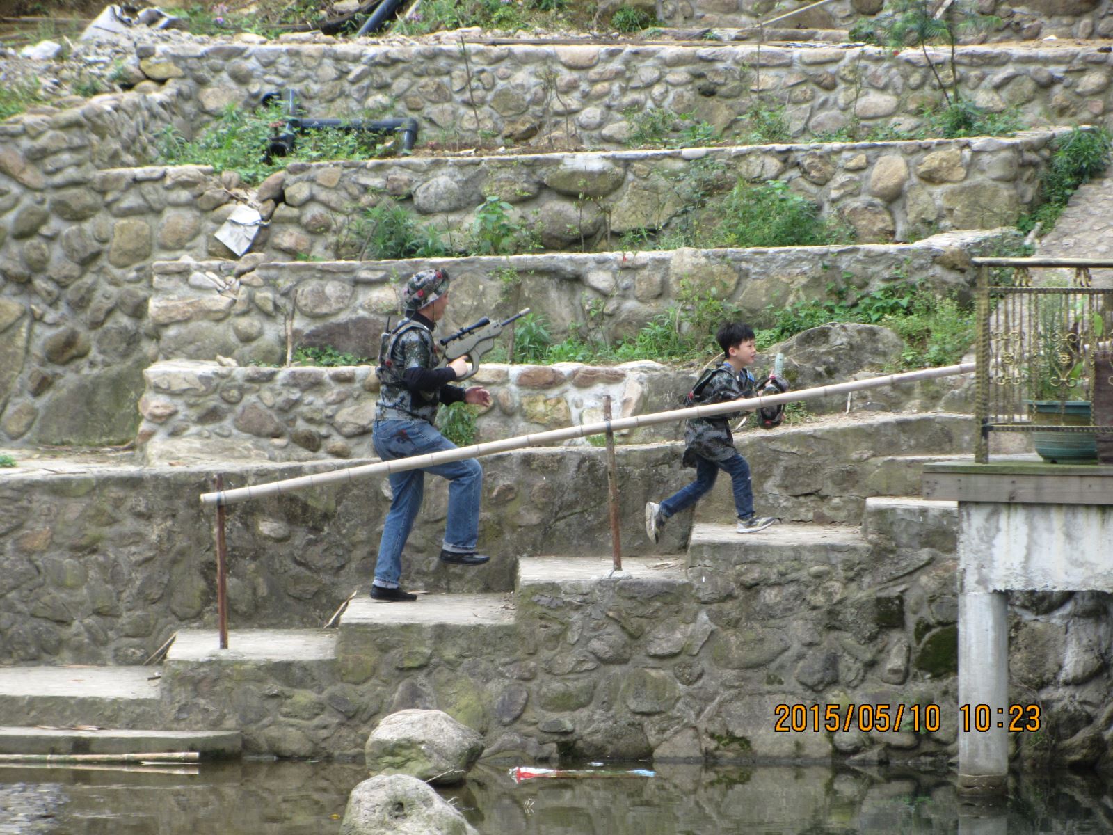 第一场:黑鹰队守,花猫队攻。黑鹰队迅速过到溪对面的磨房里,大家对位置进行了分配,占据有利地形,有的在一层柱子后面守住过溪的通道,有的在二层窗户边上占领至高点,还有的在山坡上隐蔽准备出其不意,另外还有守住后方路口的,一切就绪,就等“花猫”队进攻。