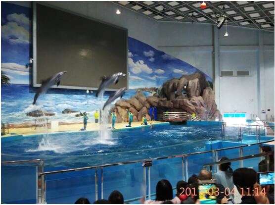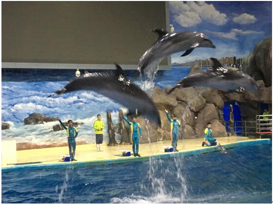 海豚和教练上演人豚共舞,站立、握手、唱歌、跳舞、冲浪、腾空跃起、摇呼啦圈、海豚音……活泼可爱的海豚妙趣横生的表演,从它们萌萌的动作里能感觉到海豚的乖巧,以及它们与训导员之间的密切关系。每到精彩处观众都会爆发出惊叹或掌声 。表演结束,海豚们或在池里优雅地划过,或与训导员亲昵地撒娇状,让观众真心的依依不舍。海豚表演是整个海洋世界游玩的重头戏,让人有一种还想再看一场的感觉。